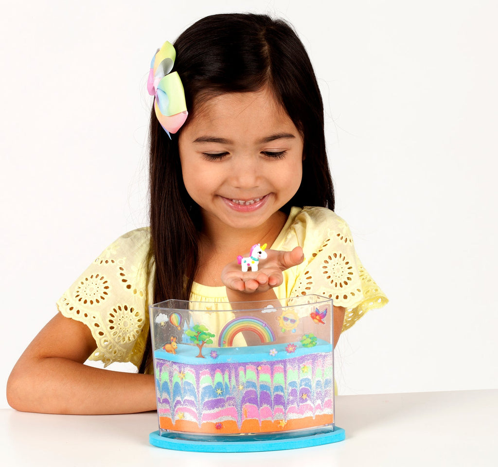Includes 5 colors of sand, design tool, glitter, clear window frame and unicorn figurine. Our "less mess, more fun" version features a fitted foam cap to hold your sand in place.